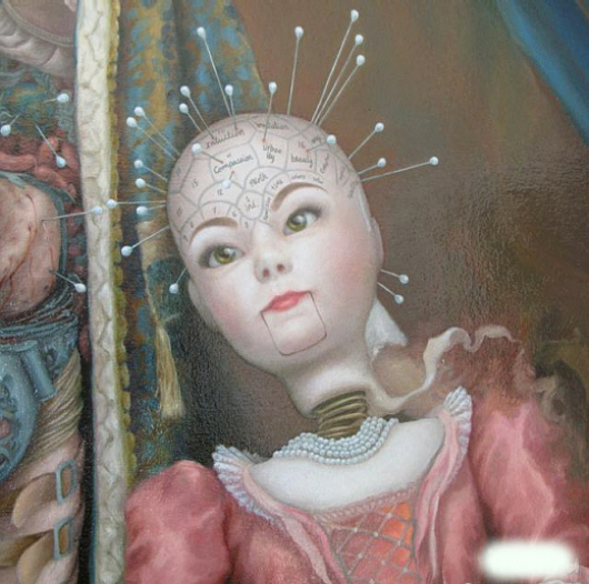 Рисунок-кодировка, направлен на Душу, на желание Души стать зомби. На голове куклы обозначены участки разделяющие голову на определённые зоны. Это разделение необходимо понимать так: мозг зазомбированного человека выполняет программы, внесенные в мозг. В каждый отсек разделённого мозга вносятся определённые программы Иголки – это энергии Поля 6 Зет, они заполняют мозг негативом. Энергии выполняют программную задачу.