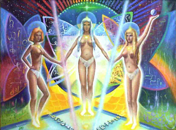 Рисунок-кодировка, направлен на Душу (в центре рисунка изображён круг). Kодировка на принятие Душой зла негативных энергий (3 человека), 6 рук- концентрация на негативных энергиях, идущих в Душу (возле руки вверху круг). Крылья для концентрации внимания на Душе. Калейдоскоп красок – для желания принять кодировку.