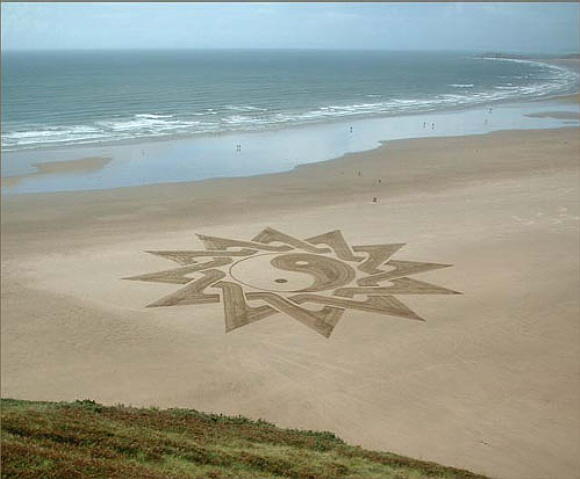Рисунок выполнили инопланетники. Содержание рисунка: В центре изображена планета Земля, разделена на две одинаковые части (светлая и тёмная). Для нормальной жизнедеятельности планеты должно быть равное количество энергетики со знаками плюс и минус. Планета Земля (на рисунке круг) окружена большими треугольниками (носы инопланетных кораблей) и будет спасена, нормализует жизнь благодаря помощи инопланетников.