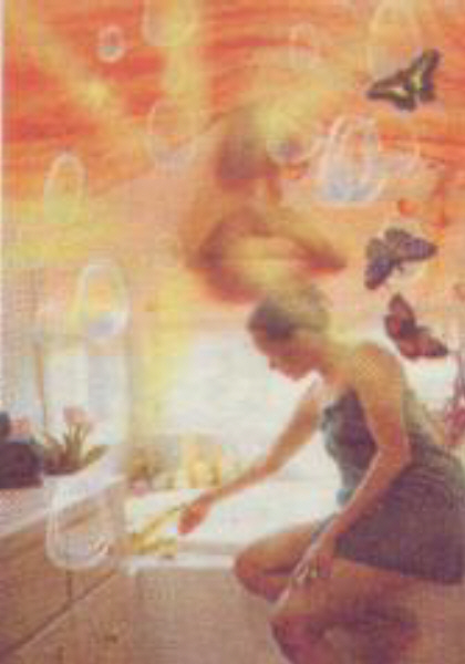It shows a dream of a negative contactee. On the background we can see that the contactee’s shining face is represented with red hues. The butterflies symbolize daydreams. The contactee dreams of serving the Forces of Light (the right hand against a white background); but she does not know how to do it, where to start because her life was too sinful before her consciousness woke up and she decided to follow the righteous path. During the dream the Forces of Light teach earthlings. When a human brain is asleep, it is very susceptible to receiving information.