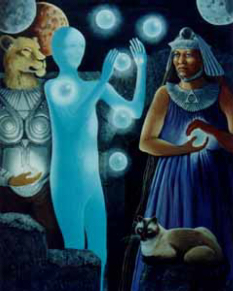 Рисунок- кодировка, направлен на Душу, на желание Души принять негатив и служить негативу (чёрной магии). Инопланетный житель и пять голубых шаров символизируют Душу. Цвет для желания принять кодировку. Чёрный маг и кошка- для фиксации внимания на негативе. В руках мага изображён шар (Душа) - вызвать желание Души служить негативу. Голова льва – зафиксировать внимание на силе негатива.