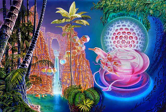 Рисунок-кодировка, направлен на Душу, сделать пробоину в чакре Души и заполнить Душу негативными энергиями. 5 дельфинов на красном фоне символизируют Душу, заполненную негативом. Дельфины устремлены к коричневому строению (к негативу) - стремление Души получить негативные энергии. Пальмы, водопад, цветной калейдоскоп – для желания Души принять кодировку.
