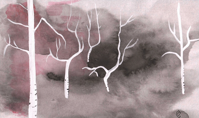 Рисунок содержит кодировку, направленную на Душу, вызвать желание Души принять негатив (5 белых деревьев – Душа, чёрные пятна на стволах – негатив). Содержится также кодировка, направленная на пробои в энергетике (фон рисунка неоднороден).