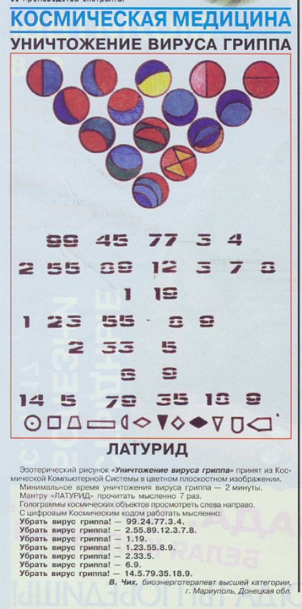 На самом деле этот рисунок содержит кодировку, направленную на ухожат (смерть). Треугольник расположен вершиной вниз. Состоит из 15 кружков- негатив. На одном из кружков 2 треугольника, таким приёмом усиливается кодировка на ухожат. Усиливают кодировку и приводимые цифры. Нижний ряд содержит 2 треугольника, расположенных вершиной вниз, что обозначает жизнь завершена.