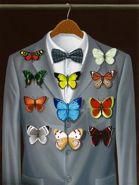 Рисунок-кодировка, направлен на Душу, вызывает ухожат (смерть). Символизируют ухожат 11 бабочек. Бабочка возле воротничка – для концентрации внимания на негативе, на кодировке. Костюм для покойника. Чёрный фон усиливает кодировку.
