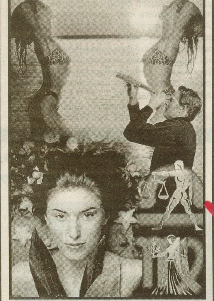 Рисунок-кодировка, направлен на Душу, вызывает ухожат (смерть). На переднем плне изображена контактантка негатива, её причёска напоминает венок. Две 5-конечные звезды - двойное воздействие на Душу. Весы для усиления кодировки. Вверху рисунка изображены 2 человека для усиления кодировки.