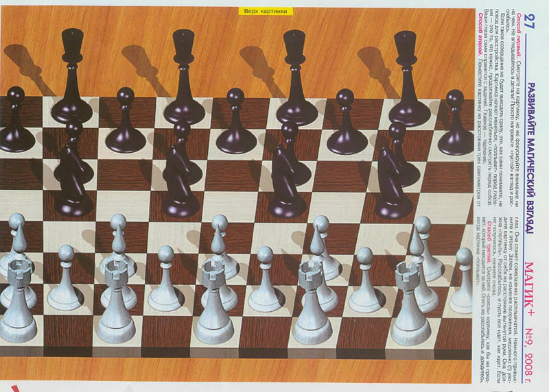 Развивайте магический взгляд! На самом деле рисунок содержит кодировку, направленную на ухожат (смерть). Для этой цели специально использована шахматная доска с фигурами. Клетки на доске имеют 2 цвета. Фигуры также имеют два цвета