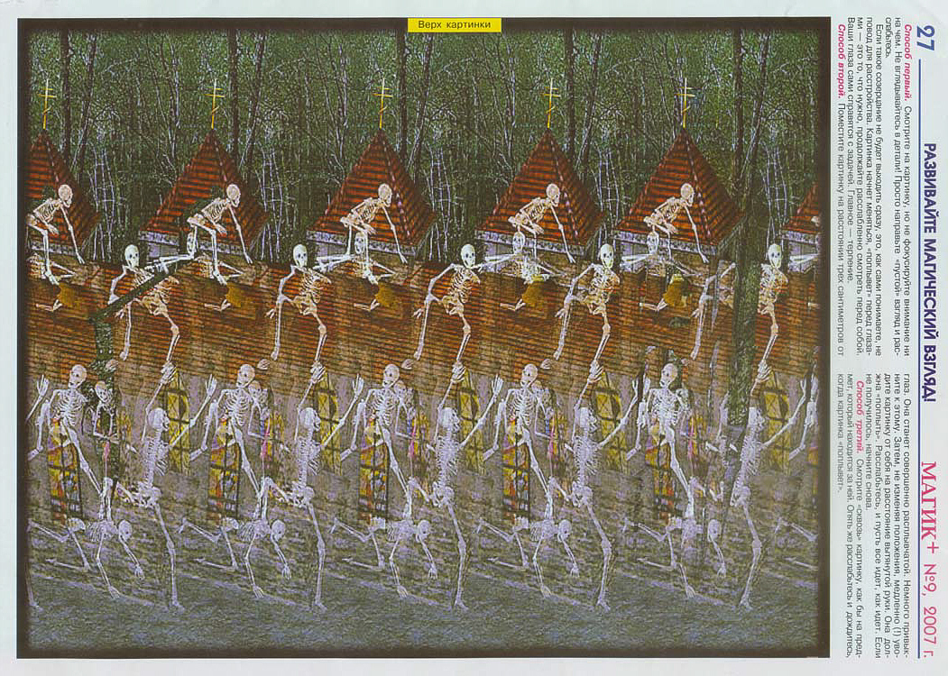 На самом деле этот рисунок-кодировка, направлен на Душу, вызывает ухожат (уход Души из физического тела, то-есть смерть). На фоне треугольников (жизнь) изображены скелеты (символ смерти). Треугольников 5 – воздействие на Душу. Крест на вершине треугольников, усиливает кодировку, направленную на ухожат. Дополняет кодировку множественность скелетов.