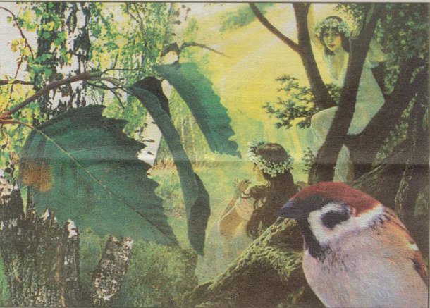 Рисунок- кодировка, направлен на Душу, вызывает ухожат. 2 человека символизируют ухожат. 2 венка - кодировка на ухожат. Птица символизирует Душу. Деревья коричневого цвета означают заполнение жизни негативом. Берёзы и зелёные листья – для желания принять кодировку. Жёлтый фон символизирует уход Души из физического тела.